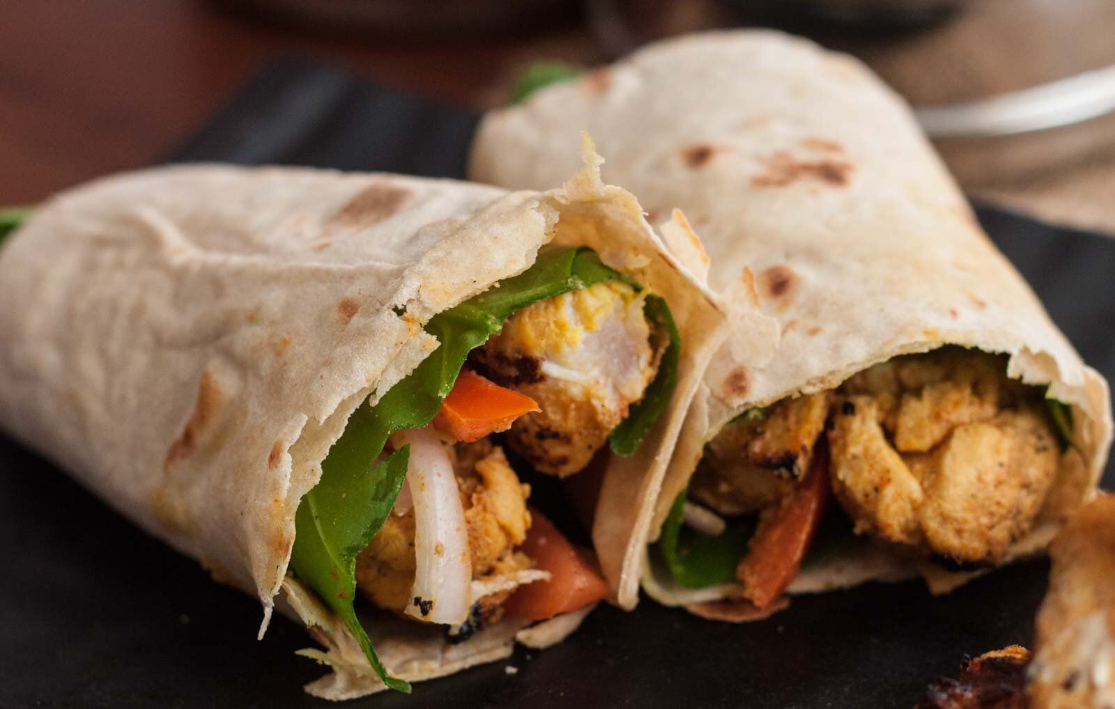 Tender chicken tikka wrapped in soft naan, layered with fresh salad and bold, zesty sauces