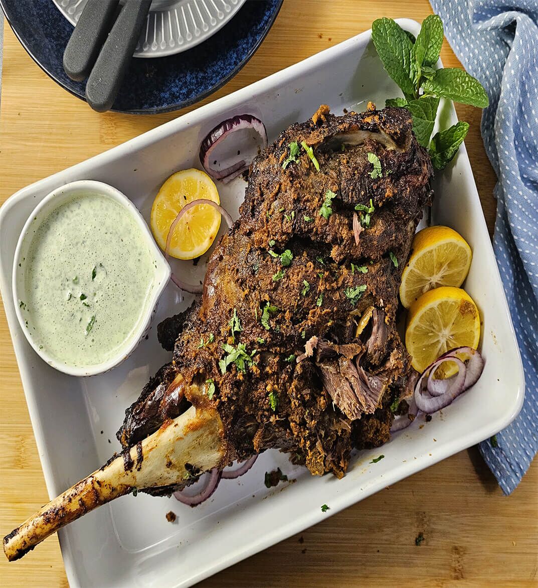 Serves 4-5 people with a 2.5-3kg lamb leg.
