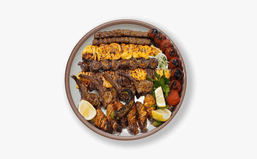Tender lamb chops, succulent chicken and lamb tikka, seekh kebab, and wings— grilled to perfection and served over Kabuli rice, topped with raisins and carrots.
